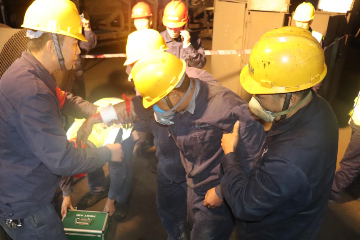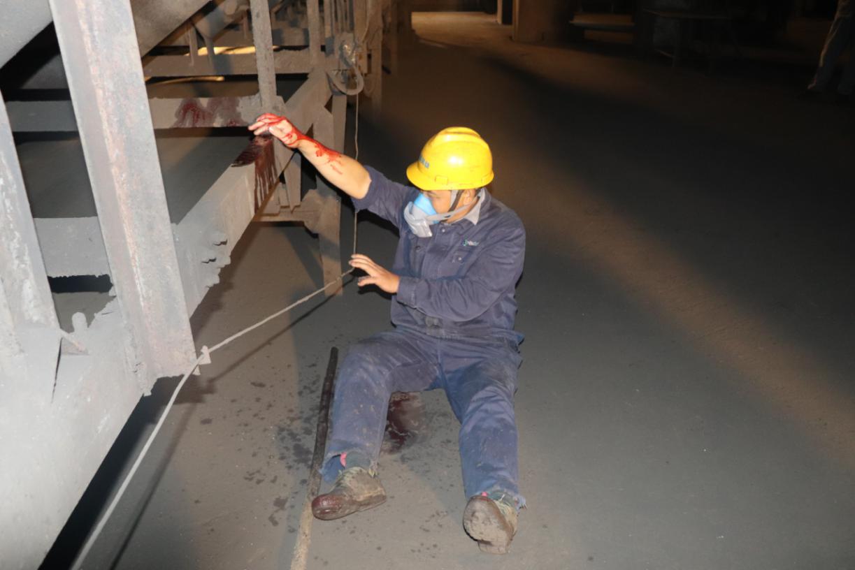 在廠長助理王武鼎宣布燒結(jié)廠皮帶絞傷事故應(yīng)急演練開始后,全體人員按照演練計(jì)劃迅速開展相關(guān)部署,現(xiàn)場模擬皮帶絞傷事故。