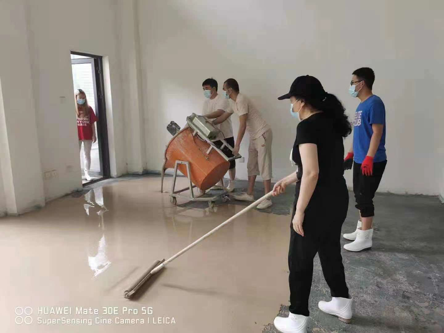 活動開始,建材事業(yè)部部長李茂春組織將到場員工分成兩班組施工,各司其職,各班組有序施工。將一定比例的石膏基自流平與水混入攪拌桶內(nèi),持續(xù)攪拌約3分鐘,一次性倒在地面上,自流平的流動性好,產(chǎn)品可以根據(jù)地面的高低不平順勢流動,對地面進(jìn)行自動找平,無需外力推動。2個(gè)班組耗時(shí)不到8小時(shí),完成450㎡施工作業(yè),等待24小時(shí)后,地面即干燥可使用。我司自產(chǎn)“藍(lán)花楹”自流平產(chǎn)品具有品質(zhì)好,施工便捷高效的特點(diǎn)。