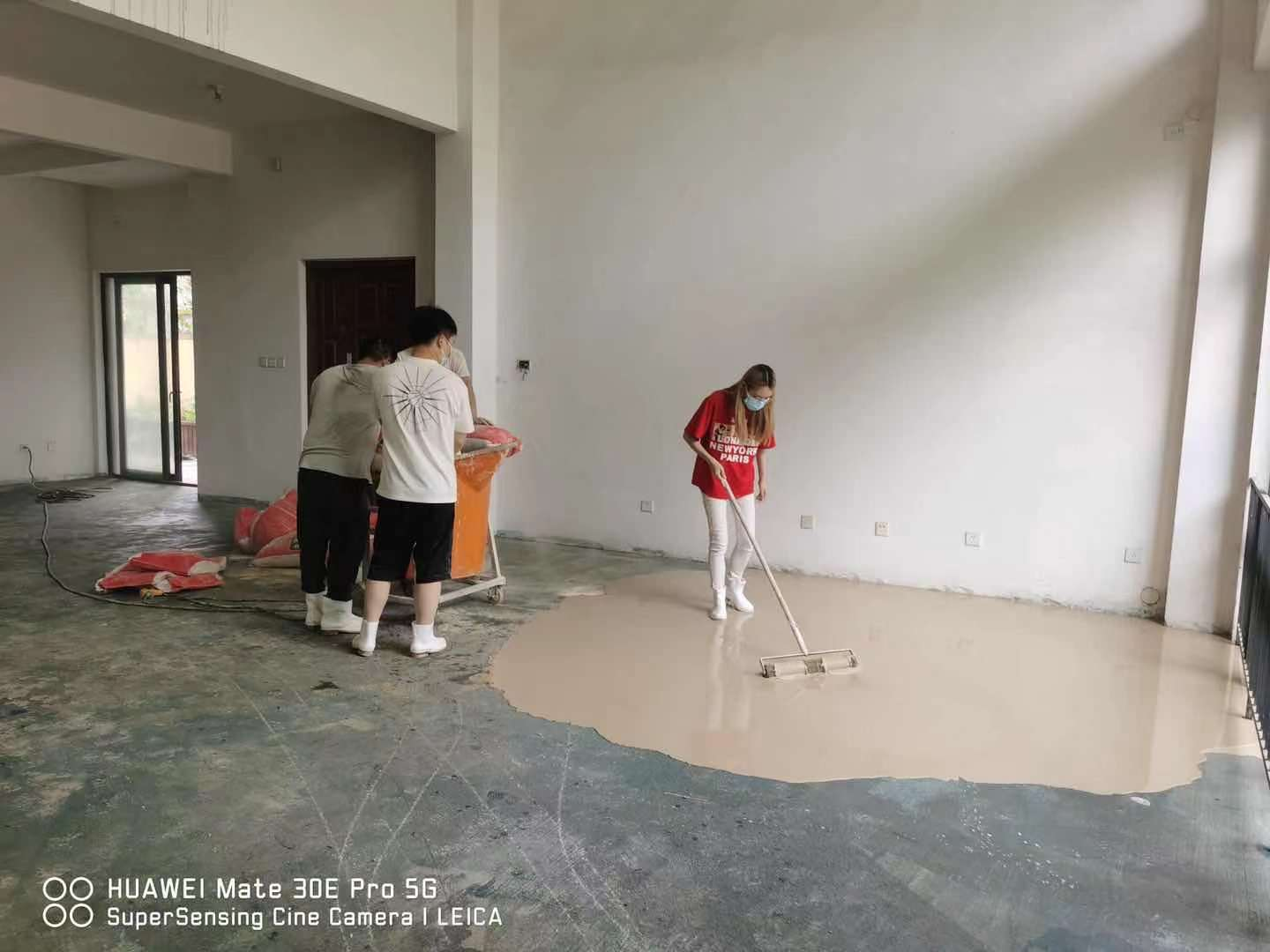 本次活動地點(diǎn)為一棟5層樓的毛坯房,總面積約450㎡;顒忧捌谝褜⒌孛娴纳硥m和小石子清理干凈,并刷上一層界面劑,界面劑起到防水、封閉的作用,避免自流平流動過程中失水過快,降低流動性,或水分下滲形成氣泡針孔。
