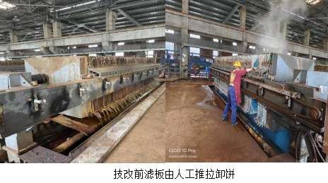 2022年3月威遠(yuǎn)藍(lán)鼎正式接手成渝釩鈦科技欣興釩廠新區(qū)水處理整套水處理系統(tǒng)。運(yùn)行至今,反應(yīng)釜壓濾機(jī)平臺(tái)在用的6臺(tái)壓濾機(jī)自動(dòng)卸餅功能全部損壞,每臺(tái)壓濾機(jī)87塊濾板,平均每臺(tái)卸餅在1.5小時(shí),每班人工依次卸餅一次,最高頻次兩次,人工勞動(dòng)強(qiáng)度大,工作效率低。高產(chǎn)期間無(wú)法滿足濾水要求,同時(shí)因?yàn)榄h(huán)境和勞動(dòng)強(qiáng)度致使員工離職率高。