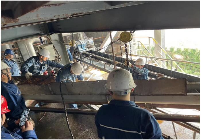 為更好解決后續(xù)物料輸送壓力,減少系統(tǒng)非計劃停機,威遠(yuǎn)藍(lán)鼎生產(chǎn)部決定將兩條螺旋技改成輸送皮帶,10月30日,蒸發(fā)濃縮停機檢修,副總經(jīng)理黃安軍、副部長楊平、宋雨鵬協(xié)同檢修班長集中檢修骨干對氯化鈉螺旋進(jìn)行技改,31日13:30螺旋改輸送皮帶技改完成進(jìn)行試車,11月2日帶料試車正常,經(jīng)過一周使用觀察,本次技改相比螺旋故障率更低,物料輸送更松散、均勻,也大大改善了干燥前端下料堵塞等問題,同時也得到了釩廠運行車間的認(rèn)可和生產(chǎn)員工一致好評,體現(xiàn)了公司敢于創(chuàng)新、技改的精神。