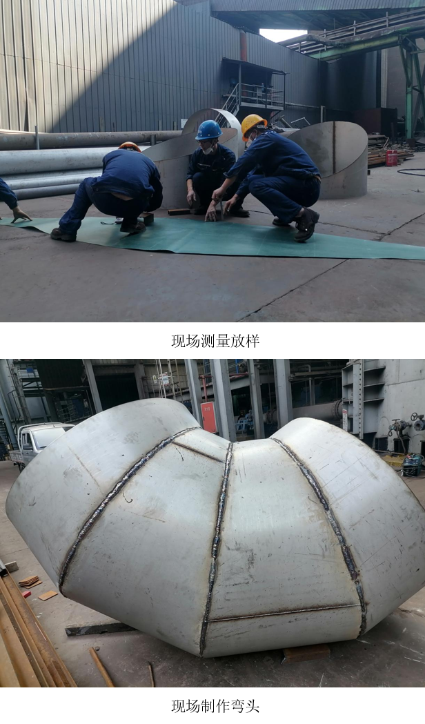 西昌藍(lán)鼎秉持“能自主絕不外委”的降本理念,為節(jié)約采購成本,僅采購了304不銹鋼短節(jié)直管材料,其余環(huán)節(jié)均由技術(shù)團(tuán)隊(duì)自主制作完成。從精準(zhǔn)測量彎頭角度、自主放樣下料,到彎頭制作成型、現(xiàn)場安裝調(diào)試,整個工藝流程實(shí)現(xiàn)100%自主化,既避免了成品彎頭及預(yù)制件的高額采購費(fèi)用,又鍛煉了隊(duì)伍在復(fù)雜工況下的實(shí)戰(zhàn)能力。